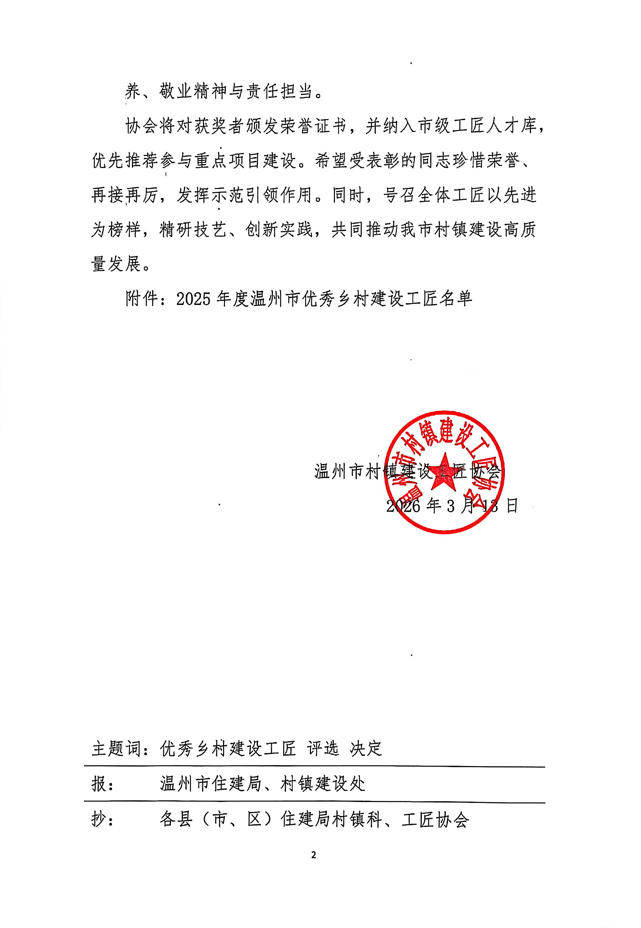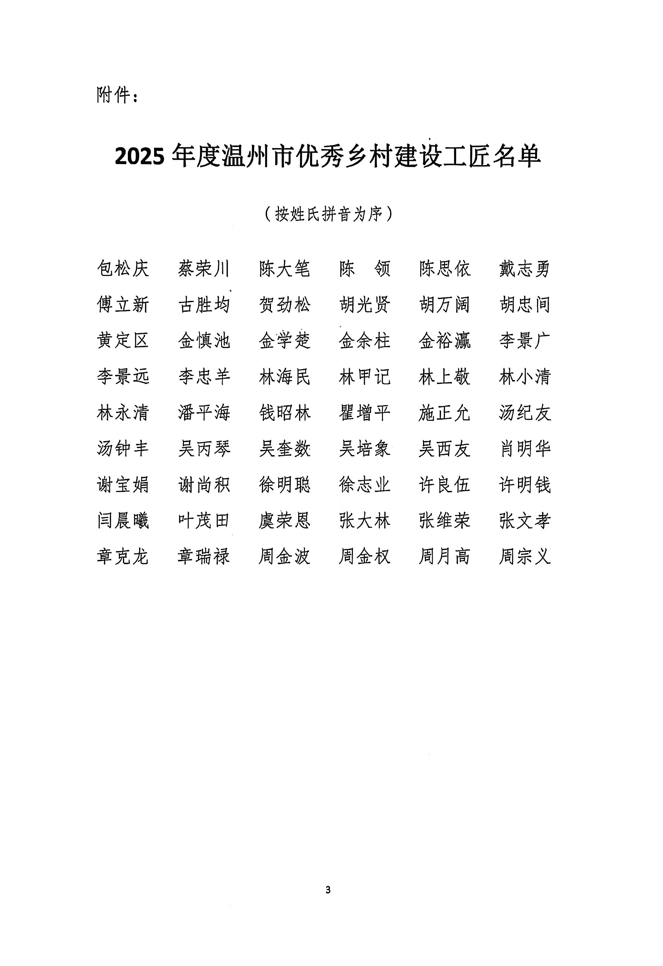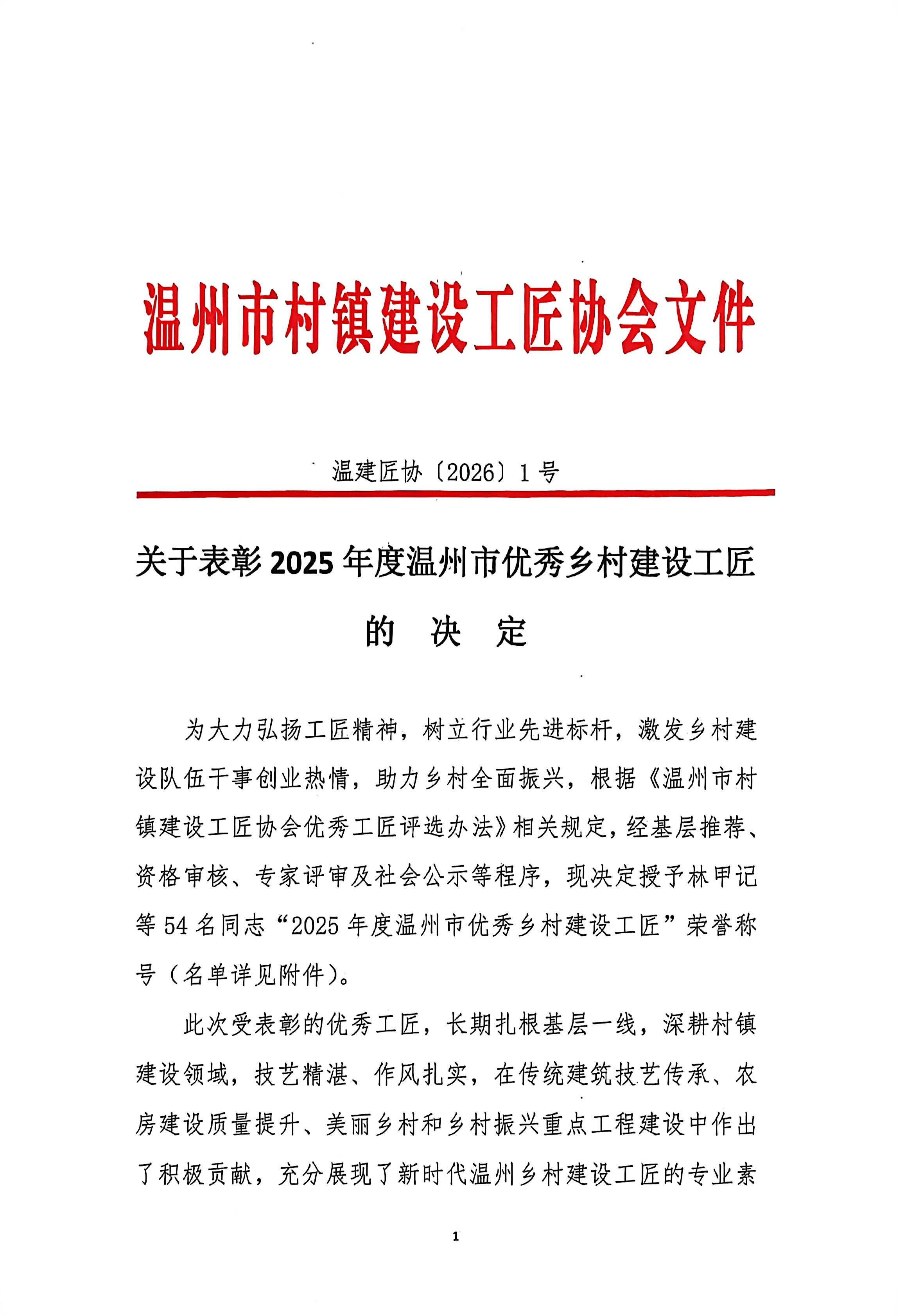 关于表彰2025年度温州市优秀乡村建设工匠的决定